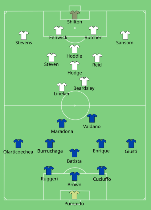 - Beardsley: l’attaquant Anglais a fourni une énorme débauche d’énergie pour gêner la relance des milieux adverses mais aussi pour apporter le danger sur le but argentin grâce à ses appels dans la profondeur. Il a manqué de réussite pour marquer un but magnifique à la Pauleta en début de match.
