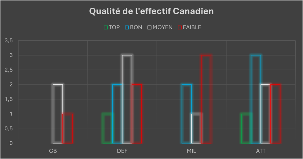 - Effectif élargi stable : le Canada ne dispose pas d’un réservoir immense de joueurs de haut-niveau et peut donc compter sur un noyau de joueurs sélectionnables relativement stable.