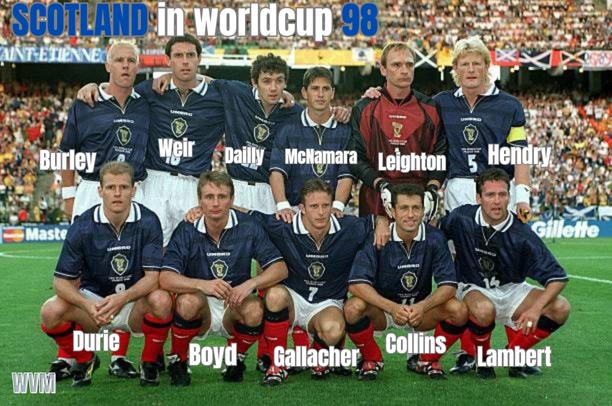 Première Coupe du monde en 1954 (car pas inscrit avant !) puis 7 autres suivront jusqu’en 1998. Les premières secondes de leur dernière participation en 1998 en France sont positives car la Tartan Army crie hourra à chaque passe réussie après le coup d’envoi écossais lors du match d’ouverture contre le tenant du titre Brésilien (10 passes en 22 secondes). Mais ils encaissent 3 minutes plus tard le premier but brésilien sur corner (C. Sampaïo) et ne mèneront jamais au score dans leur poule (Brésil, Norvège, Maroc) : bon dernier avec 3 défaites, 6 buts encaissés pour 2 marqués. Une équipe malicieuse par moments et assez entreprenante offensivement (domination contre Norvège et Maroc) mais trop friable défensivement pour obtenir de meilleurs résultats.