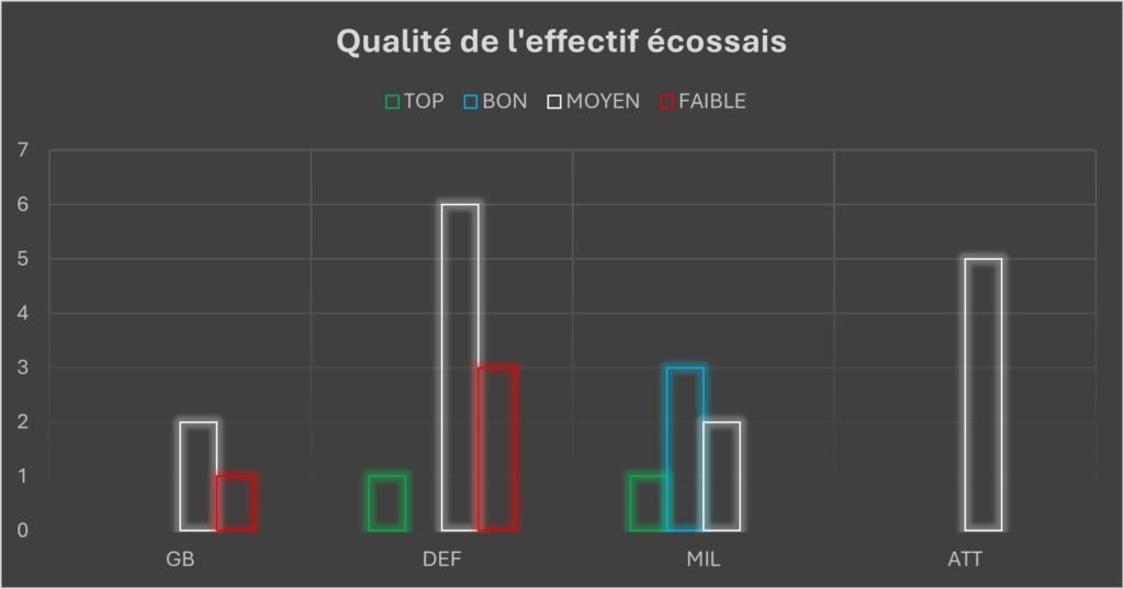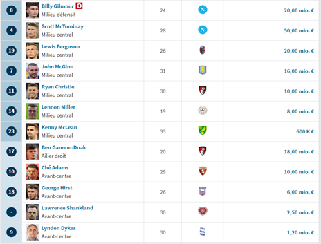 46% de l’effectif est dans des clubs des cinq championnats majeurs (5 en PL, 6 en Série A = vraie connexion italienne !) mais tous ne jouent pas régulièrement. Le reste évolue soit dans le championnat écossais (30%), soit dans des divisions étrangères de deuxième et troisième rang dont le Championship, l’Arabie Saoudite et la Croatie (25%).