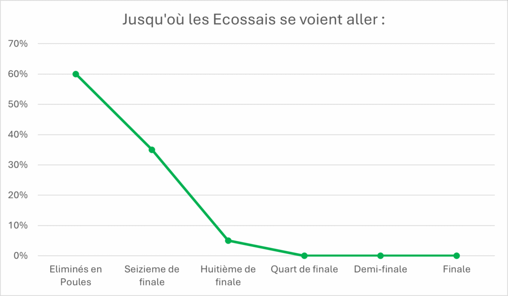 En revanche, le 16e de finale sera l’un des plus difficiles car dans notre tableau l’Ecosse tombe contre l’équipe de France, finaliste en 2022. Contre les Bleus de Deschamps, nous voyons deux scénarios possibles : type France-Irlande en 8e ou France-Islande en ¼ de finale à l’Euro 2016. Soit un match plutôt fermé et crispant que la France débloquera au talent. Soit un match ouvert où les Bleus dérouleront leur jeu offensif face aux largesses de la défense écossaise. Dans tous les cas, dans notre scénario, le parcours des fiers écossais se termine face à la der de la Desch.