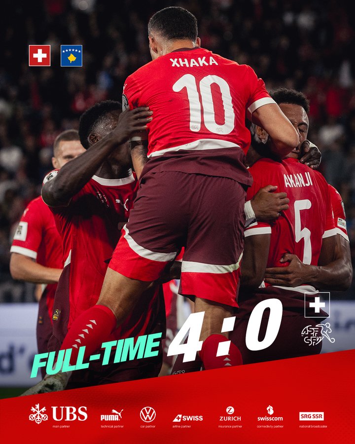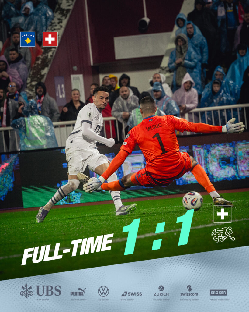 Face à une surprenante équipe du Kosovo qui a une faible chance de se qualifier directement en enflammant la rencontre, la Nati démarre très bien en étouffant son adversaire dès le coup d’envoi. Les Suisses se procurent deux occasions franches mais ne convertissent pas donc le Kosovo s’engaillardit et revient bien dans la rencontre. 0-0 à la pause. La Nati va rattaquer pied au plancher et ouvrir le score à la 47e minute par Vargas. Derrière le but, le match s’équilibre et se débride. Les Kosovars qui poussent finissent par égaliser d’une très belle frappe de Muslija à la 74e. La fin de match sera pourtant bien gérée par la Nati malgré quelques piqûres de leur adversaire du soir. Score final 1-1.