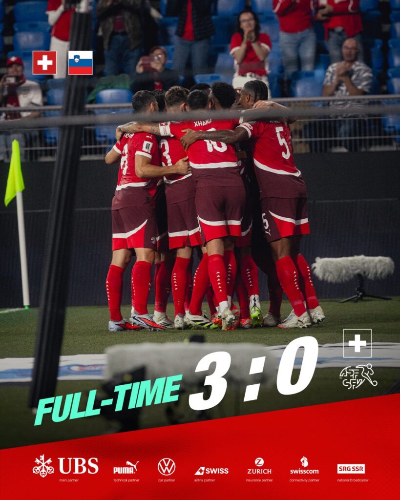 Face à des Slovènes frileux et attentistes, la Nati a entamé le match en dominant son adversaire et ouvre le score une nouvelle fois sur corner à la 18e puis double la mise de la même manière à la 33e (par Embolo qui signe déjà son troisième but des qualifications). N’Doye inscrira le troisième et dernier but 5 minutes plus tard, 3-0 score à la pause. La 2e mi-temps sera plus terne des deux côtés mais la Nati entame parfaitement sa poule en étant seule première avec deux victoires en deux matchs, sept buts marqués et zéros encaissés.